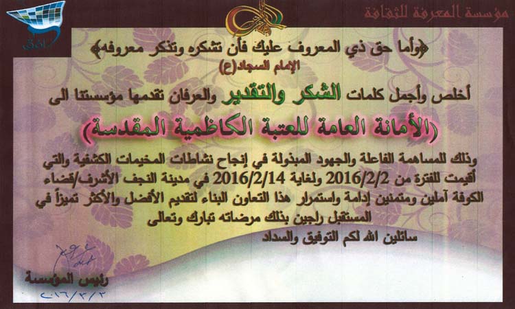 مؤسسة المعرفة تتقدم بالشكر والتقدير إلى العتبة الكاظمية المقدسة