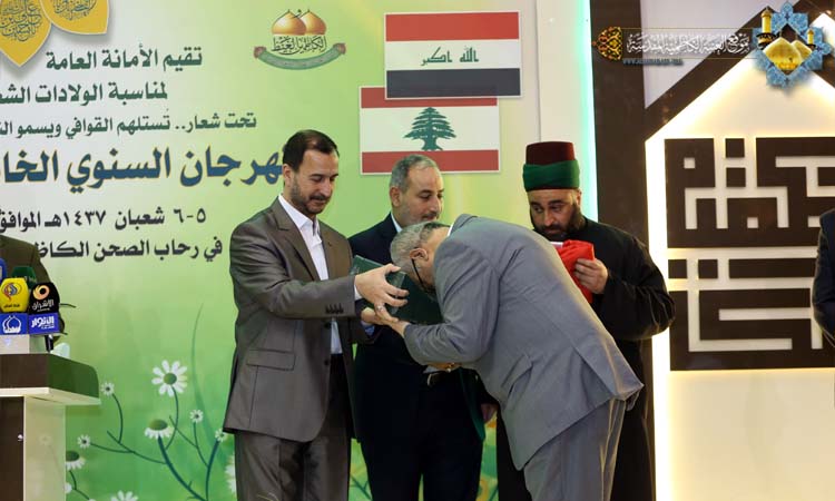 هذا وقد أهدى الأمين العام للعتبة العباسية المقدسة المصحف الشريف وراية أبي الفضل العباس إلى الأمين العام للعتبة الكاظمية المقدسة وسط أجواء إيمانية رحبة، في الوقت ذاته قدم أ.د. جمال عبد الرسول باسم المهرجان السنوي الخامس للشعر العربي الدرع التذكاري للمهرجان إلى الأمين العام للعتبة العباسية المقدسة.