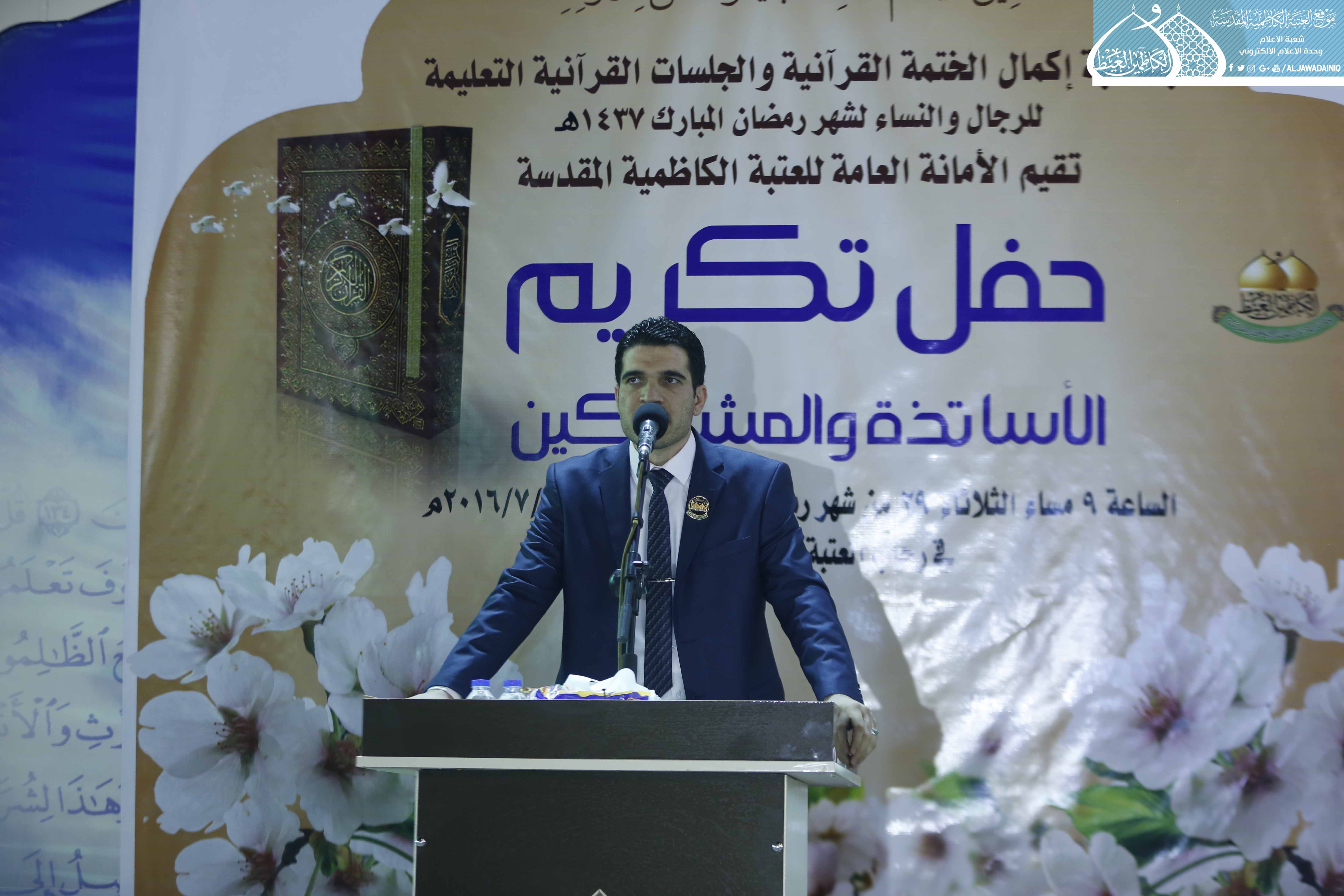 تلتها كلمة دار القرآن الكريم ألقاها المهندس جلال علي محمد قائلاً: شملت النشاطات في هذا الشهر المبارك الختمة القرآنية اليومية والمحفل القرآني اليومي، ولم يفت العتبة المقدسة أن تشمل أبطال الحشد الشعبي في تلك المراسم العبادية التي أقيمت في قواطع العمليات العسكرية.