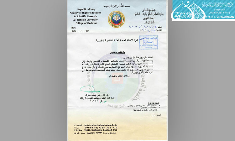 عمادة كلية الطب في جامعة النهرين تهدي شكرها وتقديرها إلى الأمانة العامة للعتبة الكاظمية المقدسة