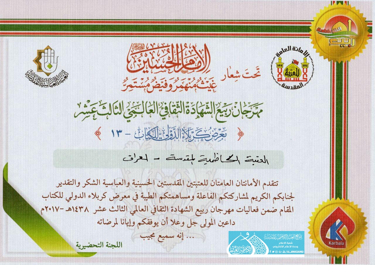 شهادة تقديرية للعتبة الكاظمية المقدسة في معرض كربلاء الدولي للكتاب الثالث عشر