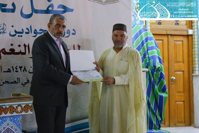 وكانت هناك كلمة لطلبة الدور ألقاها نيابة عنهم الطالب مصطفى عبد العزيز جاء فيها: إنه لشرف كبير أن نتخرج من رحاب صحن الإمامين الجوادين "عليهما السلام" وقد استطعنا من خلال هذه الدورة صقل أصواتنا والتعرف على الطبقات الصوتية والمقامات الفرعية والتركيب بين المقامات والحمد لله اليوم بدأنا نقطف ثمار تلك الجهود التي استمرت على مدى سنة كاملة، وبدورنا نتقدم بخالص الشكر والتقدير إلى الأمانة العامة للعتبة الكاظمية المقدسة وخدام الإمامين الجوادين، لدورهم الكبير في تقديم الخدمة اللازمة وتوفير الأجواء المناسبة لطلبة الدورة ونسأل الله العلي القدير لهم بدوام التوفيق والسداد. بعدها قدمت نخبة من طلبة الدورة تلاوات تعطرت بها أسماع الحاضرين، واختتم الحفل بتكريم المشرف على الدورة الأستاذ عباس المنشداوي وتوزيع الشهادات التقديرية والهدايا على الطلبة المشاركين في الدورة.