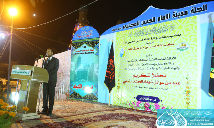 بمناسبة ذكرى ولادة سبط النبوة، وثاني الأئمة الهداة، كريم أهل البيت الإمام الحسن بن علي بن أبي طالب "عليه السلام"، أقامت الأمانة العامة للعتبة الكاظمية المقدسة وبالتعاون مع كل من الهيئة العليا لمشروع الحلة مدينة الإمام الحسن "عليه السلام" ومؤسسة العين للرعاية الاجتماعية برنامجاً خاصاً لتكريم عوائل شهداء الحشد الشعبي مساء الجمعة 13 شهر رمضان 1438هـ في مقام ردّ الشمس بمدينة الحلة الفيحاء، تحت شعار: (حكمة الإمام الحسن عليه السلام نور أضاء طريق الطف)، وذلك إكراماً للشهداء وتخليداً لأرواحهم الطاهرة وتعظيماً لجليل تضحياتهم، بحضور الأمين العام للعتبة الكاظمية المقدسة الأستاذ الدكتور جمال عبد الرسول الدباغ وخدّام الإمامين الجوادين عليهما السلام ونخبة من الشخصيات الدينية والاجتماعية في مدينة الحلة، استهل الحفل بتلاوة مباركة من الذكر الحكيم شنّف بها أسماع الحاضرين الحاج همام عدنان، أعقبها مراسم رفع راية الإمامين الجوادين "عليهما السلام" في سارية المقام الشريف، بعدها ألقى الأمين العام للعتبة الكاظمية المقدسة كلمة بهذه المناسبة، ومما ورد فيها: ( جئنا من رحاب الإمامين الجوادين "عليهما السلام"، وانقل لكم سلام خدام العتبة المقدسة ودعاءهم، الذين يحرصون على أن يكونوا معكم في كلّ سنة في هذا الشهر الكريم لإحياء مهرجان كريم أهل البيت الإمام الحسن المجتبى "عليه السلام"، ويُعد هذا المهرجان أحد مظاهر التمسك بأهل بيت النبوة "عليهم السلام"، وتحقيقاً لما أراده النبي (صلّى الله عليه وآله وسلّم) من المودة في القربى كما ورد في القرآن الكريم. ومن المؤكد أن مثل هذه المناسبات تدعونا إلى الاطلاع على سِيرهم العطرة وما ورد عنهم لكي نقتدي بهم في أقوالهم وأفعالهم. وأضاف: ( ان ما نقدّمه اليوم لعوائل شهداء الحشد الشعبي ما هو إلا شيء رمزي بعدما شرّفهم الله سبحانه وتعالى بهذه المنزلة والمكانة العظيمة التي ترفع شأنهم وأسرهم وعشائرهم وبلدهم في الدنيا، وما عند الله خير وأبقى في الآخرة. ننحني إجلالاً وإكبارا لهم، ولكل من لبّى نداء المرجعية الدينية العليا ويتصدى للدفاع عن الوطن والمقدسات، اللهم ارحم من وفد عليك شهيداً وتولّ عائلته بلطفك، وشافِ جرحانا، وانصر الأبطال الرابضين في جبهات القتال نصراً عزيزا، وافتح لهم فتحاً مبينا، اللهم اقترب عيد الفطر فاجعله عيدين بنصرهم المؤزر..)، تلاها كلمة ترحيبية من قبل الهيئة العليا لمشروع الحلة مدينة الإمام الحسن "عليه السلام"، بعدها ألقى فضيلة الشيخ قاسم الخفاجي محاضرة بعنوان: ( إشارات من حياة إمامنا الحسن "عليه السلام") استعرض خلالها السمات المجيدة والمناقب والفضائل والسجايا التي خصّها الله عزّ وجل للإمام الحسن "عليه السلام"، وما تعرّضَ له سبطُ الرسول "صلّى الله عليه وآله" وقُرّة عينه من الجورِ والظلم والقهرِ من قبل أعداء الإسلام. كما شهد الحفل مشاركة الشاعر الأستاذ رياض عبد الغني الكاظمي بقصيدة عنوانها (رسالة من شهيد) مطلعها: أفقتُ على ألقٍ أوحدِ مع الفجرِ كنتُ على موعدِ تَعجلتهُ وهو في غيبه رهين المقادير لم يولدِ وكانت هناك مشاركة لفرقة إنشاد العتبة المقدسة حيث صدحت حناجرهم بقصيدة عنوانها (حشدنا خذ سلام الخدم) التي افتخرت بشجاعة المقاتلين وتضحيات الشهداء الأبطال الذين سقت دماءهم أرض العراق، واختتم الحفل بتوزيع الهدايا النقدية والعينية من بركات الإمامين الهمامين موسى والجواد "عليهما السلام" على خمسين من العوائل المجاهدة التي ضحّت بأبنائها وفلذات أكبادها. ويأتي هذا العمل المبارك ضمن سلسلة التكريم المتواصلة في المحافظات المختلفة من قبل خدم العتبة المقدسة منذ صدور فتوى المرجعية المباركة حتى يومنا هذا، والتشرف بخدمة عوائل الشهداء والالتقاء بهم .