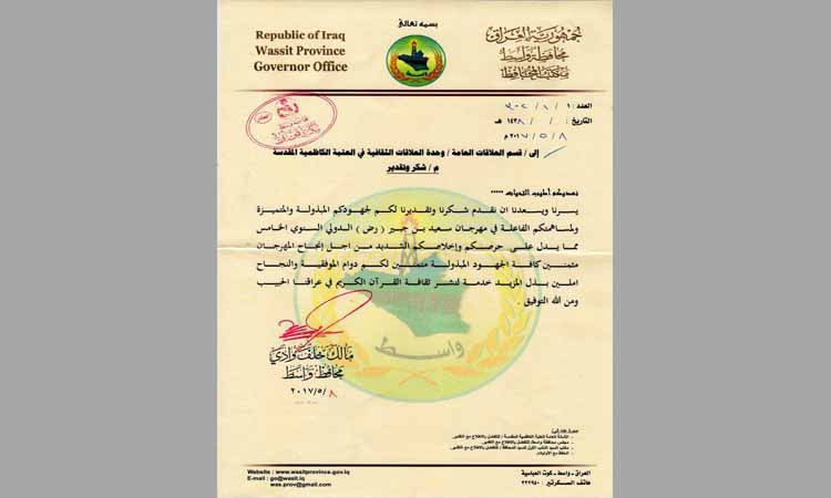 توجه محافظ واسط الأستاذ مالك خلف وادي بالشكر والتقدير إلى الأمانة العامة للعتبة الكاظمية المقدسة، قسم العلاقات العامة/ وحدة العلاقات الثقافية، وذلك لدورها المتميز وجهودها المباركة في فعاليات مهرجان سعيد بن جبير القرآني الدولي السنوي الخامس متمنين دوام التوفيق والسداد. وبدورها تسعى الأمانة العامة للعتبة الكاظمية المقدسة بمدّ جسور التعاون والتواصل مع المؤسسات التي من شأنها تساهم في نشر الثقافة القرآنية وخدمة المجتمع، فضلاً عن وترسيخ القيّم والمبادئ الإنسانية التي أكد عليها الأئمة الأطهار "عليهم السلام" وإشاعة تلك الثقافة بين طبقات المجتمع الإسلامي.