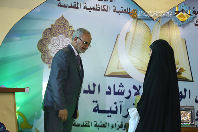 نظم قسم الشؤون الفكرية والثقافية/ دار القران الكريم/ في العتبة الكاظمية المقدسة حفل توزيع الهدايا على المشاركين في الختمة القرآنية التعليمية لكلا الجنسين شملت مراحل عمرية مختلفة والذي اقيم في رحاب الصحن الكاظمي الشريف طيلة أيام شهر رمضان المبارك, وحضر الحفل المبارك الامين العام للعتبة الكاظمية المقدسة أ. د (جمال الدباغ) وعدد من اعضاء مجلس الادارة والأساتذة المهتمون بالشأن القرآني وجمع غفير من زائري الإمامين الجوادين(ع), بدأ الحفل بتلاوة معطرة من الذكر العزيز شنف بها اسماع الحاضرين المقرئ(بلاسم جليل) ثم تلاها كلمة دار القرآن الكريم القاها السيد (عبد الكريم قاسم) وجاء فيها: (ان القران الكريم هو منهج للحياة الكريمة التي يريدها الله لعباده والسلوك القويم الذي وضعه الباري وفرضه على خلقه لينعموا به, ونحن نودع الشهر الكريم شهر رمضان المبارك الذي غمرنا بالخير والعطاء والبركة, حيث كان للقران الكريم نصيب كبير في العتبة الكاظمية المقدسة, من خلال الختمة المرتلة والجلسات والمحافل القرآنية, فكان الهدف منها تعميم الفائدة لكل من أراد ان يتعلم القرآن الكريم والتدبر بآياته).