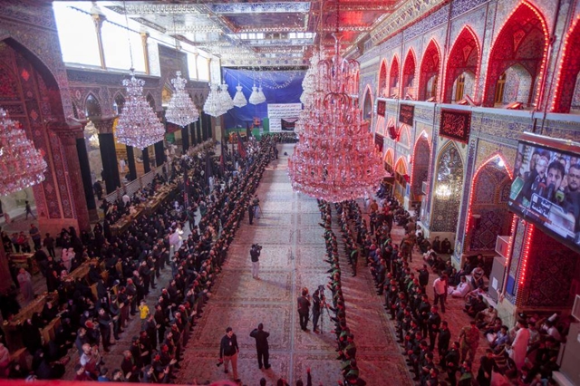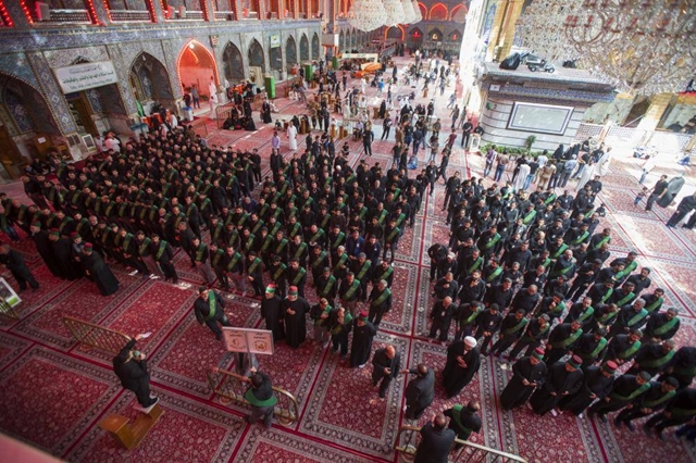 يا سائلاً ماذا جرى في البلادْ ** من حادث ٍقوَّضَ ركنَ الرشــادْ أجبـــته الدينُ قضى نحـــبهُ ** حينَ نعى جبـــــريلُ أمرَ الجوادْ بموكبٍ عزائيّ موحد خَرجَ خَدمة أبي الفضل العباس (عليه السلام) بعدَ ظهر الثلاثاء (29 ذو القعدة 1438 هـ) الموافق (22آب2017)م، وذلك لتقديم التعازي للإمام الحسين وحفيده صاحب العصر والزمان (سلام الله عليهم) بذكرى فاجعة استشهاد الإمام محمد الجواد (عليه السلام). فبعد أن اصطفوا على شكل كراديس في صحن أبي الفضل العباس (عليه السلام) وقدّموا العزاء له بقصائدٍ عزائية، توجّهت جموعهم يتقدمهم الأمين العام للعتبة العبّاسيّة المُقدّسة المهندس محمد الاشيقر وعدد من مسؤولي العتبة المُقدّسة صوب أبي الشُهداء الإمام الحسين (سلام الله عليه) . وما إن وطئت أقدامهم الحِياض الطاهرة لمرقده المُقدّس حتى كان بانتظارهم خَدَمته، ليُعقد هناك في الصحن الشريف مجلس للعزاء وقراءة المرثيات التي عبّرت عن مدى الولاء المُطلق لسيرة تاسع الأئمة محمد الجواد (عليه السلام) ونهجه والتمسك بهما، مُتَّخذين من هذهِ المناسبة نبراساً يستنيرون به طريقهم في خِدمة زائري المرقدين الطاهرين، ومجسدين في الوقت ذاته عِظم مأساة هذه المصيبة .