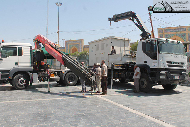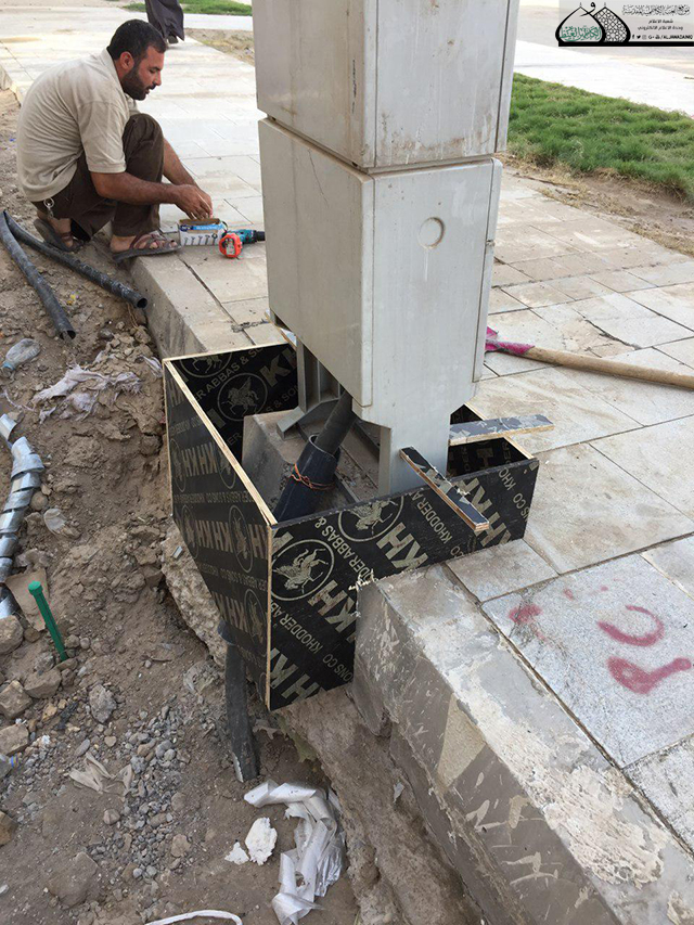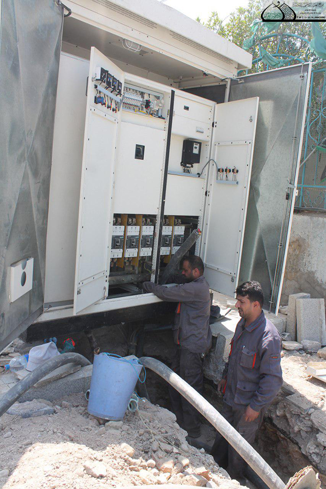وأضاف الحيدري قائلاً: تم نصب عشرة مصادر طاقة ثابتة (pillar) على جانبي شارع الإمام علي "عليه السلام" وتغذيتها بواسطة قابلوات قياس ( 3X240+120mm2 )، وبطول إجمالي مقداره (1250) م من المحطة الصندوقية (KIOSK)، وذلك لتكون مصادر تغذية ثابتة وجاهزة لاستقبال الأحمال وخصوصاً عند الزيارات والمناسبات الدينية، وفي الوقت ذاته تم تحويل مصدر تغذية أعمدة إنارة شارع الإمام علي "عليه السلام" على هذه المحطة الصندوقية ليتم بذلك السيطرة على هذه الأعمدة من جهة العتبة مباشرة، وذلك لأن المحطة مجهزة بمصدر الطاقة البديلة (خط مولدة من العتبة) مما يضمن استمرارية إنارة الشارع دون انقطاع تحت أي ظرف من الظروف.