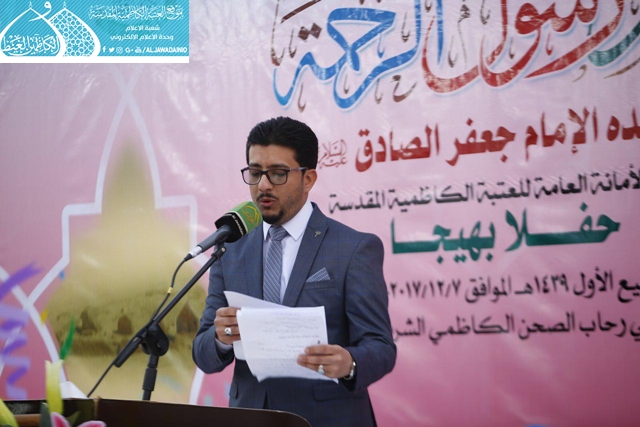 بعد ذلك اعتلى المنصة فضيلة الشيخ عَدي الكاظمي، وألقى محاضرة دينية بهذه المناسبة استعرض قبسات من مقامات رسولنا "صلى الله عليه وآله"، التي دعا إليها القرآن الكريم من أجل إحياء الإنسان، وأشار إلى أن لا نتعامل معها تعامل سطحياً بل أن تتجلى هذه التعاليم والمفاهيم في سلوكيات مجتمعنا، وكذلك أن نجعل من هذه المناسبات المباركة دروساً وعبراً نتعلم من تلك السيرة العطرة الخلق الرفيع الذي فرض على قلوب المؤمنين. وتخلل الحفل مشاركة لفرقة إنشاد الجوادين وأخرى للاستاذ الشاعر رياض عبد الغني الكاظمي بقصيدة جادت بها قريحته بأجمل كلمات الولاء للرسول الكريم وأهل بيته الأطهار ومنها هذه الابيات: