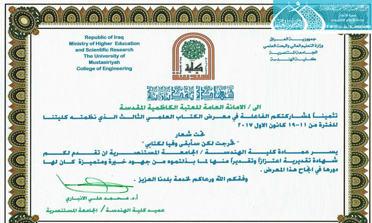 تقدمت عمادة كلية الهندسة في الجامعة المستنصرية بالشكر والتقدير إلى الأمانة العامة للعتبة الكاظمية المقدسة، وذلك لمشاركتها في فعاليات معرض الكتاب العلمي الثالث الذي أقيم في المكتبة المركزية تحت شعار: (تخرجت لكن سأبقى وفيا لكتابي).