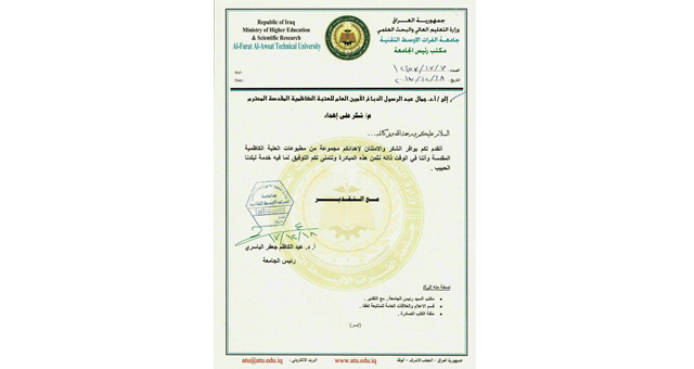 رئاسة جامعة الفرات الأوسط التقنية تقدم الشكر والتقدير إلى الأمين العام للعتبة الكاظمية المقدسة
