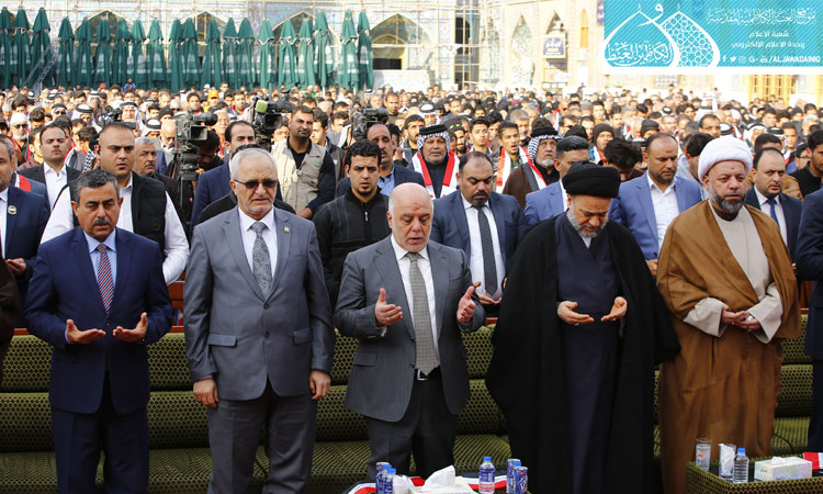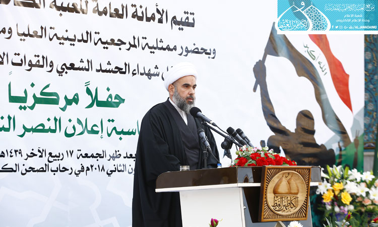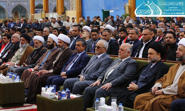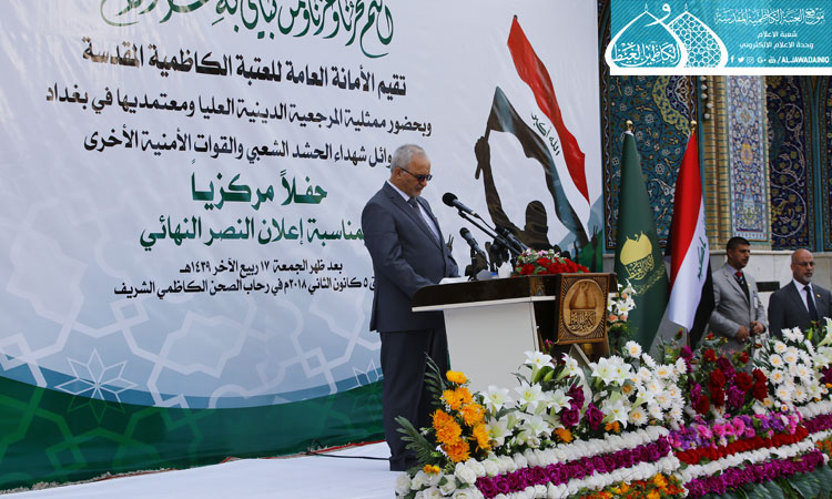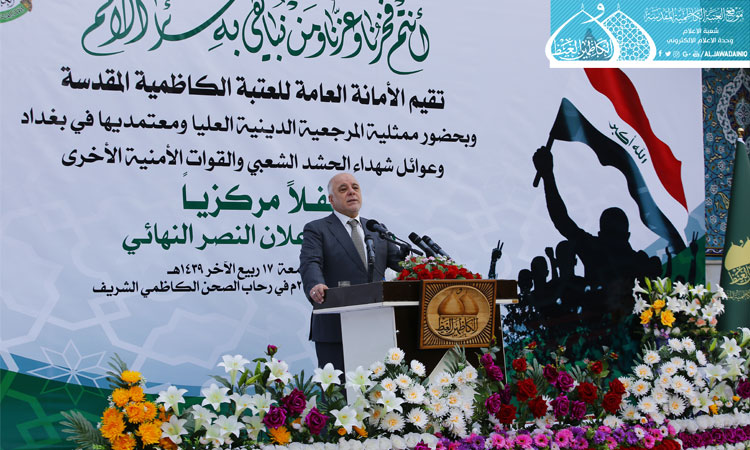 وأضاف: وأما النصر الذي كتبه العراقيون فلم يأتِ من فراغ أو جاهزاً يتقمّصهُ أبطالنا، بل جاء ثمناً للدماء الطاهرة الزكية التي أُريقت في ساحات الوغى، وتقديم الشهيد تلو الشهيد حتى تحقق النصر النهائي. أما كلامُنا عن الشهيد فنعجزُ أن نقدّم صورةً له، فالشهادةُ نعمةُ الله عزّ وجلّ العظيمة يهبها لمن يختارهُ من عبادهِ حتى يصبح شهيداً..). بعدها ألقى دولة رئيس مجلس الوزراء والقائد العام للقوات المسلحة الدكتور حيدر العبادي كلمة بهذه المناسبة قائلاً: عَقدنا هذا النصر عندما وقف الحشد الشعبي مع المؤسسة العسكرية والأمنية لمحاربة الإرهاب التكفيري، حيث وصلتْ قواتنا الباسلة إلى السهل والجبل والصحراء بل إلى أقصى نقطة في العراق، والحمد لله قد تحقق هذا النصر لجميع العراقيين ومن حقِهم أن يحتفوا به، وعلينا مسؤولية الحفاظ على هذا الانتصار بمزيدٍ من التلاحم، فينبغي تحجيم الأصوات النشاز لتحقيق كامل الانتصار، حيث أن نتائج هذا الانتصار هو أن نحاربَ الفساد وأن نحقق أعمارا ورفاهاً اقتصاديا بعد معاناة بلدنا وشعبنا من ويلات الحروب، إذ بالوحدة والنصر نستطيع أن ننهضَ ببلدنا إلى برّ الأمان.