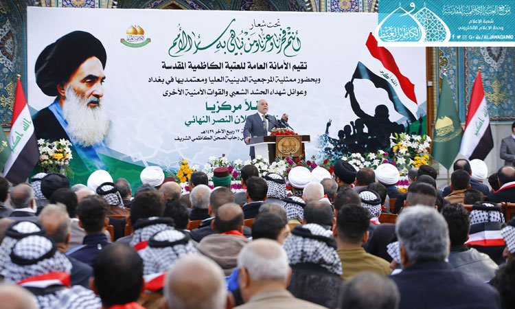 إكراماً وعرفاناً وتخليداً لأرواحهم الطاهرة وتعظيماً لجليل تضحياتهم، وانطلاقاً من مبدأ الشعور بالمسؤولية تجاه تلك العوائل المجاهدة الصابرة المحتسبة التي ضحّت بأبنائها وفلذات أكبادها وهي تفتخر بما جادت به مِنْ قربان في طريق الحق لنيّل شرف التضحية والشهادة دفاعاً عن العراق وشعبه ومقدساته، تلبيةً لنداء المرجعية الدينية العُليا المتمثلة بسماحة آية الله العظمى السيد علي الحسيني السيستاني "دام ظله الوراف"، وتحرير بَلدِنا من دنس زمر الكفر والضلال، أقامت الأمانة العامة للعتبة الكاظمية المقدسة حفلاً مركزياً بمناسبة يوم النصر الكبير، وتحت شعار: (أنتم فخرنا وعزّنا ومن نباهي به سائر الأمم)، بحضور دولة رئيس مجلس الوزراء والقائد العام للقوات المسلحة الدكتور حيدر العبادي، وممثلية المرجعية الدينية العليا ومعتمديها في بغداد، ورئيس ديوان الوقف الشيعي سماحة السيد علاء الموسوي، والأمين العام للعتبة الكاظمية المقدسة الأستاذ الدكتور جمال عبد الرسول الدباغ وأعضاء مجلس الإدارة، وممثلي العتبات المقدسة والمزارات الشريفة، والعديد من السادة أصحاب السماحة والمشايخ من فضلاء الحوزة العلمية الشريفة، والقيادات الأمنية والشخصيات الاجتماعية والحكومية وذوي شهداء الحشد الشعبي والقوات الأمنية الأخرى.