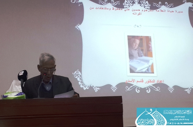 لبّى وفد العتبة الكاظمية المقدسة دعوة حضور الحفل التأبيني الذي أقامته جمعية المترجمين العراقيين بمناسبة الذكرى السنوية التاسعة لرحيل العلامة الدكتور حسين علي محفوظ، بحضور عدد من الشخصيات الأكاديمية والثقافية، وشهد الحفل سلسلة محاضرات تناولت شذارت من حياة العلامة الدكتور محفوظ ومكانته محلياً ودولياً، وخدمته لناصية العلم وآثار مدرسته العبقرية التي عُرفت بأدوارها الإنسانية ورصانتها العلمية والفكرية والثقافية، فضلاً عن نتاجاته المتخصصة في اللغات والدراسات الشرقية التي امتدت أغصانها لتنشر بذور الحضارة العربية والإسلامية.