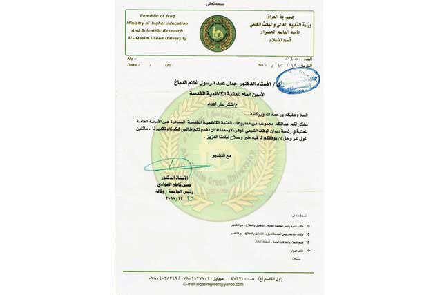 توجّه رئيس جامعة القاسم الخضراء الأستاذ الدكتور حسن كاطع العوادي بالشكر والتقدير إلى الأمين العام للعتبة الكاظمية المقدسة الأستاذ الدكتور جمال عبد الرسول الدباغ، وذلك لأهداء مجموعة من مطبوعات إصدارات العتبة المقدسة إلى مكتبة الجامعة، سائلين المولى عزّ وجل أن يوفقكم لما فيه خير وصلاح لبلدنا العزيز.