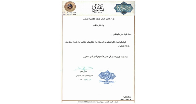 مؤسسة مكتبة الإمام أمير المؤمنين "عليه السلام" تتقدّم بالشكر إلى الأمانة العامة للعتبة الكاظمية المقدسة