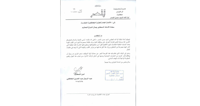 مكتبة آية الله السيد حسن الصدر تتقدم بالشكر والتقدير إلى الأمانة العامة لللعتبة الكاظمية المقدسة