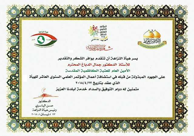 تقدّمت هيأة النزاهة بالشكر والتقدير إلى الأمين العام للعتبة الكاظمية المقدسة، وذلك لجهوده المباركة في إنجاح أعمال المؤتمر العلمي السنوي العاشر 2018 الذي انعقد في رحاب الصحن الكاظمي الشريف بعنوان: (مواجهة الفساد ـ أدوار والتزامات)، واسهاماً في عملية التغيير والتطوير النوعي لبناء المجمتع العراقي بناءً رصيناً، وتحقيق أهداف النزاهة ومكافحة الفساد في مفاصل المؤسسات الحكومية، وعدم السماح لتلك السلوكيات المنحرفة أن تسري بين الأوساط الاجتماعية.