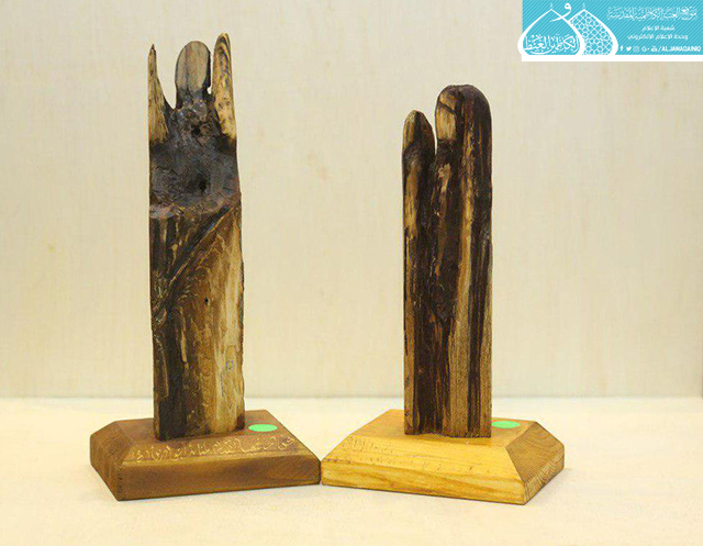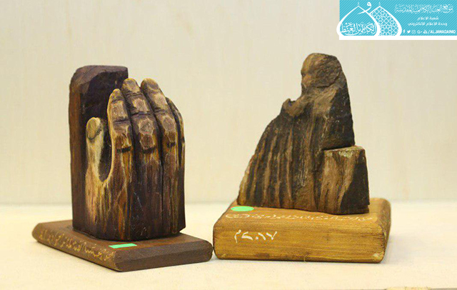 قطع خشبية ما يميزها إنها من بقايا الهيكل القديم للمنائر الذهبية في الصحن الكاظمي الشريف، تعرضت إلى التأكل ونحتها تقادم الزمن حتى تغيّرت أشكالها وألوانها، واليوم أضحت تُحفاً فنية ذات قيمة عالية تحاكي الروح الإنسانية، وتُعرّف عن نفسها وقدمِها وموروثها وما اكتسبته من هذا المكان الطاهر .. بعد أن تعاملت معها أنامل ملاكات وحدة النقش والزخرفة في العتبة الكاظمية المقدسة بمهارة فنية عالية وحرفية وإتقان، وللتعرف عن طبيعة تلك الأعمال تحدث مدير وحدة النقش والزخرفة الأستاذ إبراهيم النقاش لموقع العتبة المقدسة الإلكتروني قائلاً: بعدما شهدته المنائر الذهبية من أعمال صيانة فضلاً عن استبدال بعض قطع الأبواب الرئيسة للصحن الكاظمي الشريف، استطاعت وحدة النقش والزخرفة من استثمار هذا الخشب الذي يتميّز بقدَمهِ وعراقته وجودة أنواعه فضلاً عن أشكاله المختلفة حيث تم إضافة بعض اللمسات البسيطة عليه بأسلوب إبداعي ممزوج بالنضج والأحساس الكبيرين ليخرج لنا بمجسمات تشكيلية وصور متنوعة ذات دلالات فكرية وملامح أثرية في غاية الروعة والجمال، كل قطعة منها تتيح فسحة من التأمل وتثير الانتباه، وتستطيع أن تحكي إلى الجمهور عن قصتها وسرّها كونها جزءً من هذه الرحاب القدسية الطاهرة.