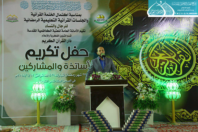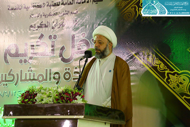 تلتها كلمة دار القرآن الكريم، ألقاها مديرها الحاج جلال علي محمد مبيّناً: أرى من المناسب في هذا المقام إلى الإشارة إلى ظاهرة مؤلمة وهي هجر القرآن الكريم.. فالقرآن الكريم هو رمز الحياة الكريمة ووسيلة للنجاة وسبب لكل رُقي في الدنيا والآخرة فيما لو التزمنا به فقد أنزله تعالى (تِبْيَانًا لِكُلِّ شَيْءٍ وَهُدًى وَرَحْمَةً وَبُشْرَى لِلْمُسْلِمِينَ)، وهو أول الثقلين الذي أوصانا بالتمسك به رسول الله "صلى الله عليه وآله وسلم" فمما يؤسف له أن هذا الكتاب المكتنز بكل ما يبث الحياة وأخلاق الله تعالى غادره الكثيرون فنهلوا من غيره، وانعكس ذلك في السلوك والنظريات والقوانين الوضعية، وقد نجد القرآن الكريم مجرد كتاب للتبرك به وقد تحول إلى كتابات ولوحات مزخرفة تزيّن القاعات والمساجد، وقد نرافقه في شهر رمضان ونهجره بعد انقضاء الشهر.
