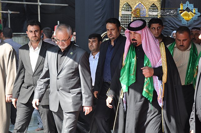 بعدها توجه الوفد إلى مقر إدارة العتبة المقدسة وعبّر الشيخ الهايس عن بالغ سروره بهذا اللقاء المبارك قائلاً: (باسمي وباسم أبناء العراق نرفع أحر التعازي إلى العالم الإسلامي بذكرى استشهاد الإمام الحسين(عليه السلام) جئنا لنشارك إخوتنا أبناء مدينة الكاظمية المقدسة في إحياء الشعائر الحسينية وهذه المناسبة الأليمة, وأضاف :كانت لنا زيارات إلى العتبة الكاظمية المقدسة ولأكثر من مناسبة ووجدنا الإخوة المسؤولين في هذه الرحاب الطاهرة يرفعون شعار الوحدة الوطنية والعراق خيمة لكل العراقيين والدعوة بما كان يدعو به الأئمة الأطهار(عليهم السلام) بوحدة صفوف المسلمين وتوحيد كلمتهم, ويجب على أبناء العراق أن يتوحدوا وينتفضوا على الظلم وأن يتصدوا لكل من يحاول زرع الفتنة والفرقة بين أبنائه, ثم أختتم حديثه قائلاً أشيدُ بالتطور العمراني في هذا المكان المقدس والخدمة التي يقدمها العاملون في هذا المكان الطاهر ونتمنى ان نكون كلنا خدماً للإمامين الجوادين(عليهما السلام)..)