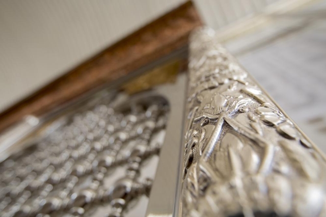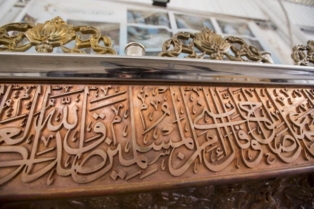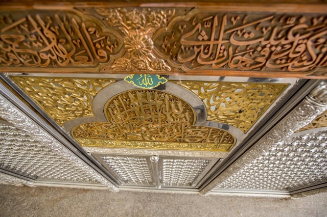 وبيّن الغرابي: "يتألف كلّ شباك من مشبكين يتوسطهما مشبك ثالث خُصص للباب، يعتلي كلّ مشبك مثلث زخرفي يُحاط في جوانبه السفلية بإطار فضي لأرباع دوائر، ويرتكز على هذه المشبكات شريط كتابي فوقه إفريز زخرفيّ يتوسّطه شريطٌ كتابي آخر وبنقوش نباتية غاية في الروعة، يعتلي هذا الإفريز شريطٌ كتابي آخر ثبّتت فوقه أجزاء مذهبة من زهور اللوتس، كذلك يتألّف كلّ شباك من أربعة أعمدة جانبية ذات نقوش وزخارف نباتية تستند على إطارٍ فضي مزخرف، وجميع هذه الأجزاء ترتبط وتركّب على هيكلٍ خشبي تميزت صناعته بأفخر أنواع خشب الساج ".