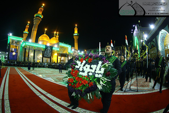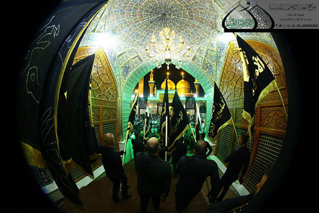 في الوقت ذاته شهدت المراسم تسلم الأمين العام للعتبة الكاظمية المقدسة راية العتبة الشريفة لضريح الإمام الثامن الضامن علي بن موسى الرضا "عليه السلام" من قبل وفد العتبة الرضوية المقدسة المشارك في هذا العزاء.