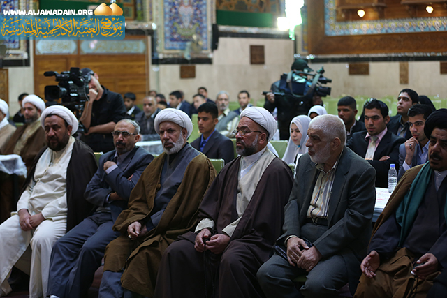 (أيها الإخوة .. بولادته(ص) كشفت الغمة عن هذه الأمة فلنتوحد ونجمع شملنا ويجب ان نحافظ على هويتنا الإسلامية ووحدتنا من خلال اتباع الرسول في منهجه ومسيرته لأنه حجة الله علينا كما جاء في كتاب الله العزيز(وَمَا آتَاكُمُ الرَّسُولُ فَخُذُوهُ وَمَا نَهَاكُمْ عَنْهُ فَانتَهُوا وَاتَّقُوا اللَّهَ), وأن نعيش امة متحابة متعاونة تدعو الى كلمة الله (ادْعُ إِلِى سَبِيلِ رَبِّكَ بِالْحِكْمَةِ وَالْمَوْعِظَةِ الْحَسَنَةِ). وحث العرسان بقوله : ان الحياة فيها صيانة للعرض وعفة النفس والمحافظة على تعاليم الدين والقيم الاجتماعية الأصيلة, إن الزواج والاحتفاء في هذا المكان المقدس ما هو إلا فخر وشرف عظيم أن تبدأ الحياة الزوجية من جوار الإمامين الجوادين(ع) في بناء أسر مسلمة تضع أول أقدامها على الطريق الصحيح وحفاظها على الأخلاق السامية كما شكر سماحته جميع المشاركين والمساهمين والمتبرعين لهذا العمل المبارك سائلاً الله تعالى ان يوفق الجميع لكل عمل صالح فيه طاعة لله ورسوله وأهل البيت(ع).