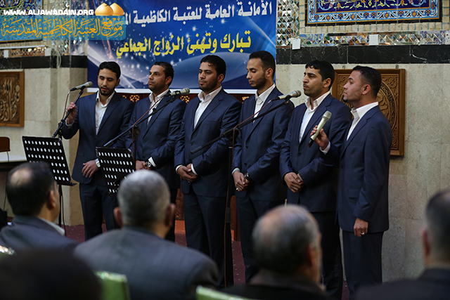 سعياً منها لدعم الشباب المؤمن وإيماناً منها بأن هذا العمل المبارك الذي يحمل في طياته الكثير من الجوانب الإنسانية والأخلاقية والتربوية التي تتحقق فيها أهداف التكافل الاجتماعي, وتشجيعاً للشباب المؤمن على الزواج لتكوين أسر أسلامية شعارها حب العترة الطاهرة من آل محمد(عليهم السلام), وبمناسبة ذكرى ولادة نور النبوة الباهر الرسول الأكرم محمد(ص), وحفيده ومحيي شريعته الإمام جعفر الصادق (ع), أقامت الأمانة العامة للعتبة الكاظمية المقدسة حفل الزفاف الجماعي لمجموعة من الشباب المؤمن في الصحن الكاظمي, بحضور أعضاء مجلس إدارة العتبة سماحة الشيخ(مكي شطيط الطائي والحاج علي السلامي والحاج محمد صميم) وعدد من الشخصيات الدينية وأهالي العرسان .