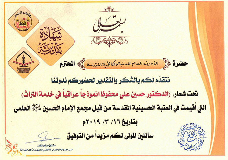تقدّم مدير مَجْمَع الإمام الحسين العلمي لتحقيق تراث أهل البيت "عليهم السلام" التابع إلى الأمانة العامة للعتبة الحسينية المقدسة، الأستاذ مشتاق صالح المظفر بالشكر والتقدير إلى الأمين العام للعتبة الكاظمية المقدسة الأستاذ الدكتور جمال عبد الرسول الدباغ، وذلك لحضوره في الندوة العلمية التي أقامها المَجْمَع تحت شعار: ( الدكتور حسين علي محفوظ انموذجاً عراقياً في خدمة التراث )، سائلين المولى العليّ القدير لهُ بالتوفيق والسداد.