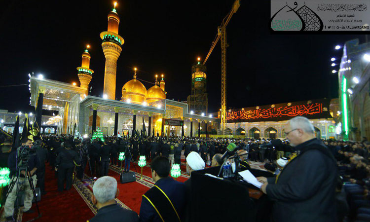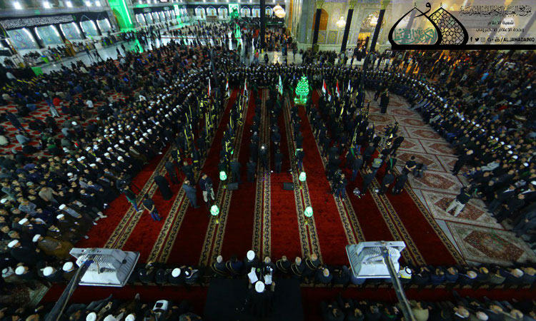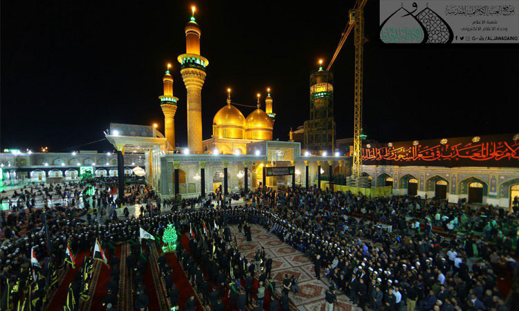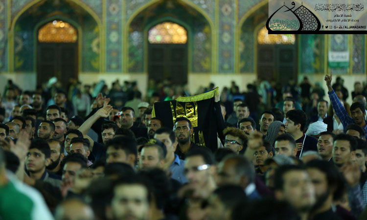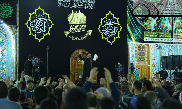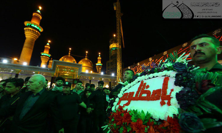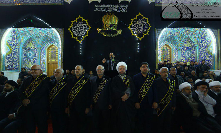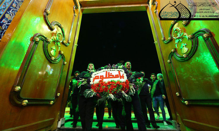 خّدام العتبة الكاظمية المقدسة يرفعون رايتَيْ الحُزن والصبر وسط ذرف الدموع وتعالي الهتافات بـ (لبيك يا مسموم)