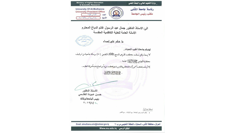 رئاسة جامعة المثنى تتوّجه بالشكر والتقدير إلى الأمين العام للعتبة الكاظمية المقدسة