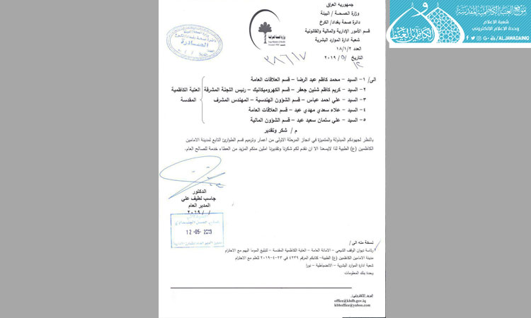 دائرة صحة بغداد ـ الكرخ .. تتقدّم بالشكر والتقدير إلى عددٍ من خدّام العتبة الكاظمية المقدسة