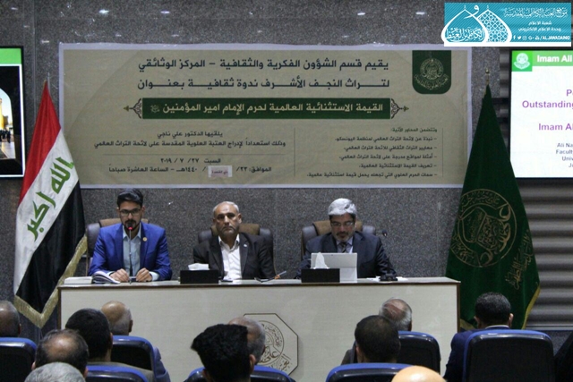 وفد العتبة الكاظمية المقدسة يحضر ندوة ثقافية بعنوان: القيمة الاستثنائية العالمية لحرم الإمام أمير المؤمنين "عليه السلام"