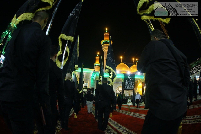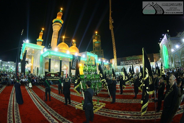 بعدها بدأت مراسم استبدال الرايتين الشريفتين وسط هتافات جموع المعزّين بـ (لبيك يا مسموم)، حيث كانت هناك مشاركة للخادم كرار الكاظمي بقراءة مجموعة من المراثي، واختتم المراسم الرادود الحسيني الحاج باسم الكربلائي بقراءة القصائد العزائية واسى بها النبي الأكرم وأهل بيته الأطهار "عليهم السلام" بهذا المصاب الجلّل.