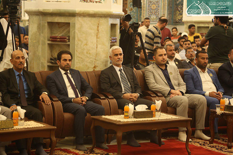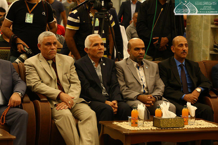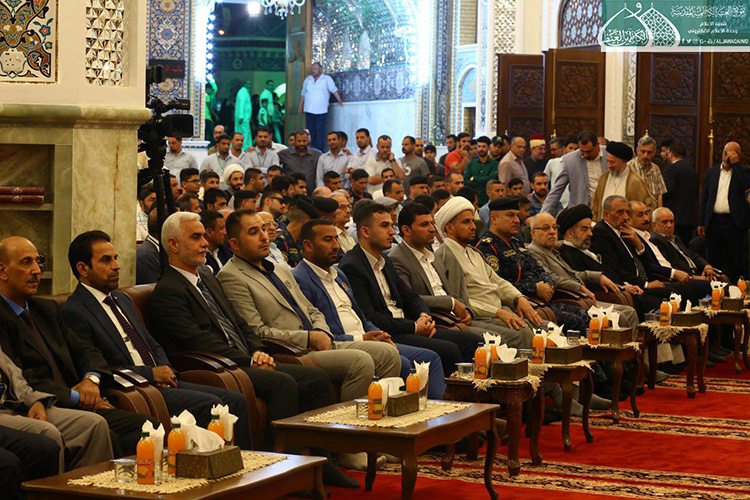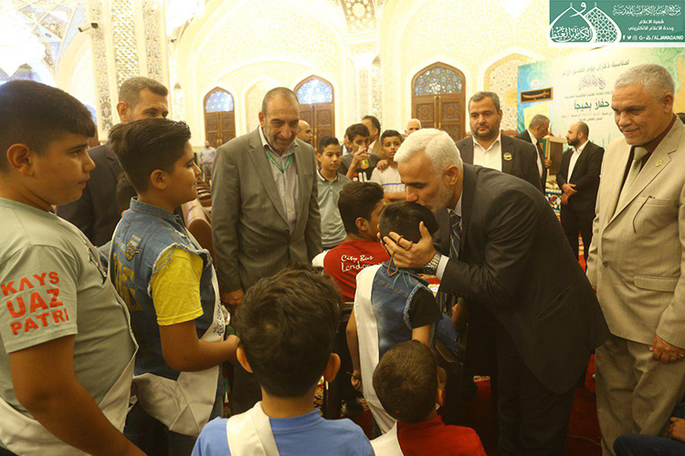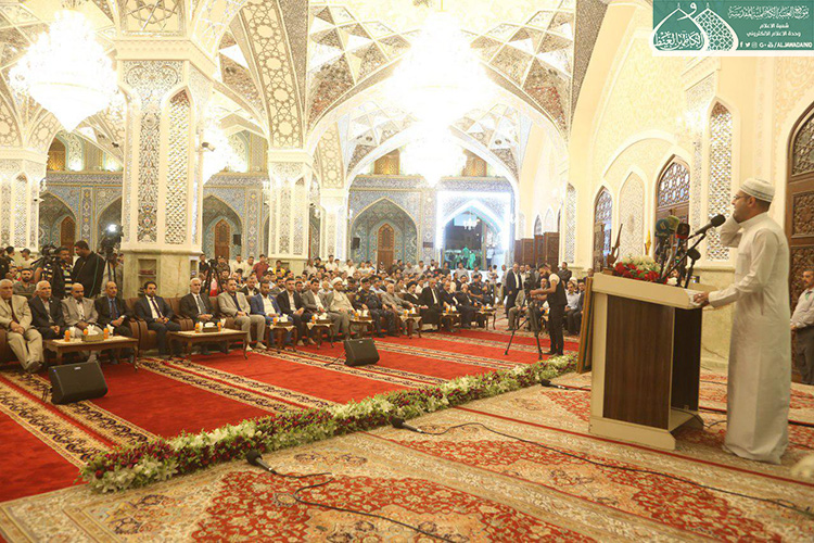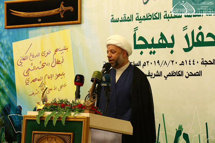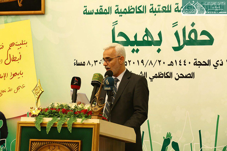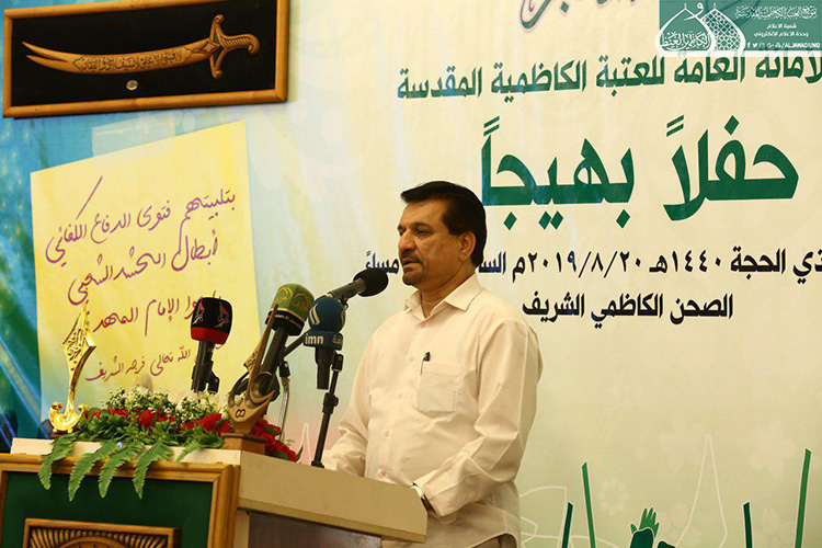 استهل الحفل بتلاوة آيٍ من الذكر الحكيم شنّف بها قارئ العتبة المقدسة الحاج همام عدنان أسماع الحاضرين، تلتها كلمة الأمانة العامة للعتبة الكاظمية المقدسة بهذه المناسبة ألقاها أمينها العام الأستاذ الدكتور حيدر الشمّري قائلاً: ( إن يوم غدير خم ليس حدثا تأريخيا عابرا مرت عليه قرون وقرون بل عقيدة لازمة الإيمان ما زلنا نعيش ألطاف ذلك اليوم البعيد زمانيا والقريب مكانيا على قلوبنا وضمائرنا .. فلولا ذلك اليوم الأغر ما سجل أبناء علي وموالوه على صفحات التاريخ أعظم انتصاراته بتضحيات أبنائنا من الحشد الشعبي بعد أن لبوا نداء المرجعية الدينية العليا المتمثلة بسماحة آية الله العظمى السيد علي الحسيني السيستاني "دام ظله الوارف" في فتوى الدفاع الكفائي، فبذلوا أرواحهم رخيصة دفاعا عن البلاد والعباد وفداءً للمقدسات بعيدا عن أي مقابل دنيوي .. تركوا بيوتهم وعوائلهم وراحتهم من أجل علي عليه السلام .. وأبناء هؤلاء الشهداء هم أمانة بأعناق كلّ من يؤمن بإمامة علي "عليه السلام" فهؤلاء اليتامى عندما فقدوا أباءهم .. فنحن بالمقابل وجدنا وطنا خاليا من داعش .. فهل جزاء الإحسان إلا الإحسان؟.. فكما بايع الناس عليا يوم الغدير فأبناؤنا من الحشد الشعبي بايعوا إمام زمانهم "عجل الله تعالى فرجه الشريف" وهبوا لحفظ بيضة الإسلام تمهيدا لظهوره المبارك إيمانا منهم بأن الأمة لن ترفع رأسها حتى ترفع اليد التي رفعها رسول الله "صلى الله عليه وآله وسلم" يوم الغدير.. فولاية علي عليه السلام حصن الله كما جاء في الحديث القدسي (ولاية علي بن أبي طالب حصني، فمن دخل حصني أمن من عذابي).