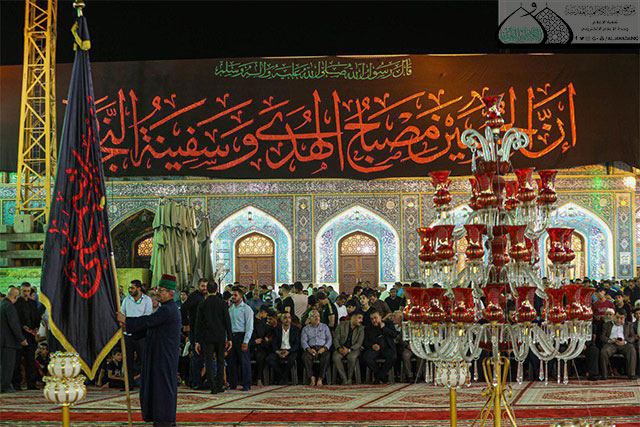 في كلّ عام نقف لنترقب بروح تَلتهب بحزن الطفّ، ونتوشح بالحزن والأسى ونرسم في كوامن عشقنا لكربلاء لوحة أبطالها صفوة الخلق، لتجدد فينا العزم على نصرة الحقّ حين خرج سبط الرسول الكريم "صلّى الله عليه وآله وسلّم" لطلب الإصلاح ورفض الظلم والطغيان، والتضحية من أجل إحقاق الحقّ وإقامة العدل والدفاع عن القيم الإسلامية النبيلة، واليوم العتبة الكاظمية المقدسة تُعلن حِدادها لأبيّ الضيم، وسيد شباب أهل الجنة الإمام الحسين وأهل بيته "عليهم السلام"، وإقامة المراسم السنوية لاستبدال الرايتين الخضراويتين التي تخفق فوق القبتين الشامختين للإمامين الكاظمين الجوادين "عليهما السلام" برايتي الحزن والأسى السوداويتين، بحضور الأمين العام للعتبة الكاظمية المقدسة الأستاذ الدكتور حيدر حسن الشمّري، وأعضاء مجلس الإدارة، وممثل المرجعية الدينية العُليا في مدينة الكاظمية المقدسة سماحة السيد حُسين آل ياسين، ووفود العتبات المقدسة والمزارات الشريفة، وعدد من الشخصيات الدينية والاجتماعية والقيادات الأمنية، وجمع غفير من أبناء مدينة الكاظمية المقدسة، وزائري الإمامين الجوادين "عليهما السلام".