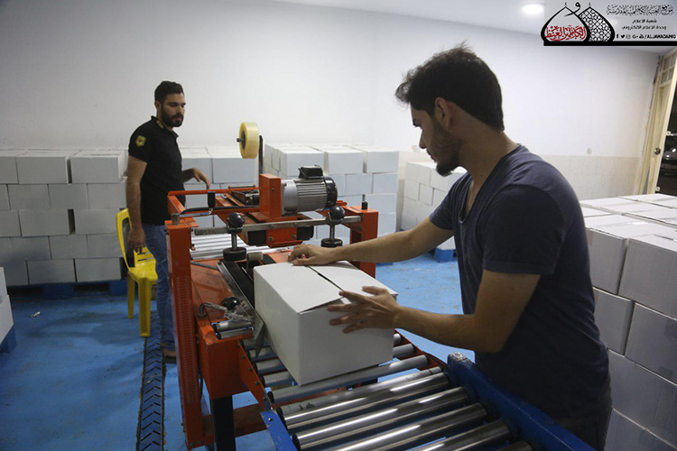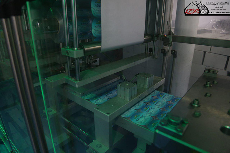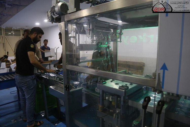 وبيّن في حديثه أن الطاقة الانتاجية في الوقت الحالي قد تصل إلى أكثر من (300) صندوق ويضم الصندوق الواحد (60) قدحاً يومياً والعدد في تصاعد مع مراعاة الجودة، وأن هذه الكميات من المياه توزع على النحو الآتي: منها لسدّ حاجة مضيف الإمامين الجوادين "عليهما السلام"، وأخرى ستوزع إلى أماكن مبيت الزائرين الكرام التابعة للعتبة المقدسة، وجزء منها سيوزع على المواكب الحسينية والجوامع والحسينيات والبيوتات المُضيّفة في مدينة الكاظمية المقدسة والمناطق المجاورة لها. كما أشار إلى أن الأمانة العامة للعتبة الكاظمية المقدسة شرعت منذ وقت مبكر بتجهيز المعمل بالمواد الأولية من الكارتون، وعبوات الأقداح والأغلفة المصنوعة من مادة الألمنيوم.