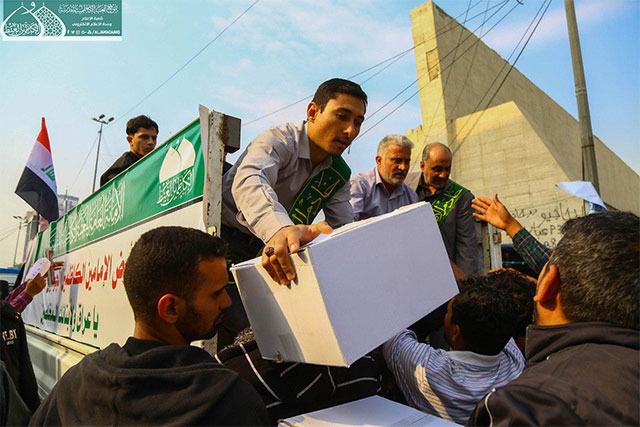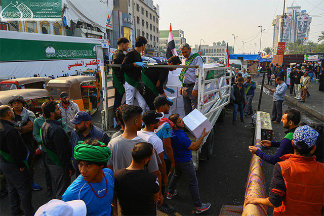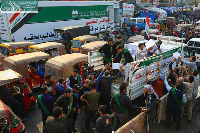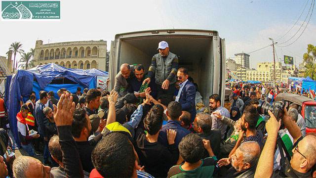 ما زالت العتبةُ الكاظمية المقدسة وبتوجيه من أمينها العام الأستاذ الدكتور حيدر حسن الشمّري تتواصل بإرسال قوافل الدعم اللوجستي وحملات الإمدادات الإنسانية إلى ساحة التحرير في العاصمة بغداد، حيث يجهز مضيف الإمامين الجوادين "عليهما السلام" التابع لقسم العلاقات العامة وجبات الطعام لتوزيعها على المتظاهرين السلميين، فضلاً عن توفير كميات كبيرة من مياه المراد الصحية، والاحتياجات الإنسانية الأخرى.