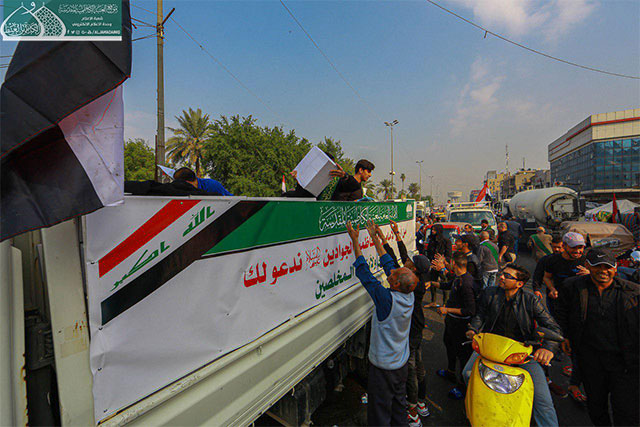 الأمانة العامة للعتبة الكاظمية المقدسة تواصل إرسالها قوافل الدعم اللوجستي إلى المتظاهرين السلميين من ابناء العراق
