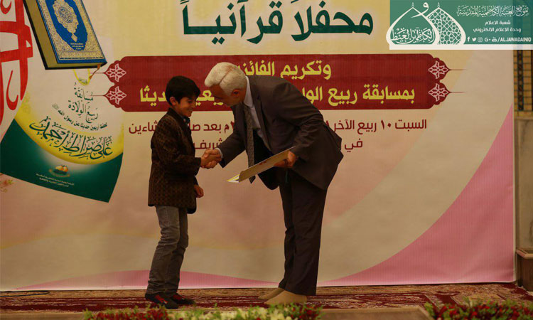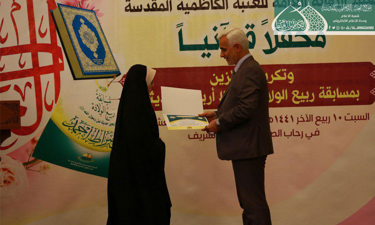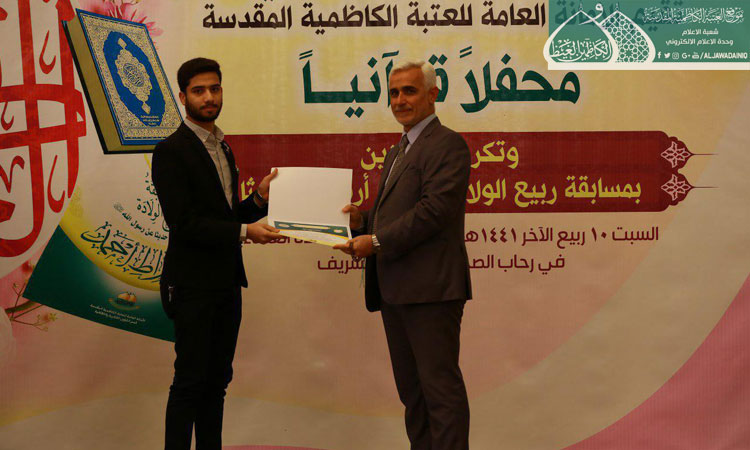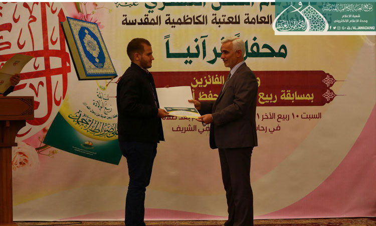 واختتم الحفل بتوزيع الشهادات التقديرية والجوائز النقدية والهدايا على الفائزين في القرعة العلنية لاختيار أسماء العشرة الأوائل والعشرة الثانية منهم وقد شمل التكريم ومنح الجوائز لجميع المشاركين الذين حصلوا على (100) درجة في مسابقة ربيع الولادة تشجيعاً لهم من الأمانة العامة للعتبة الكاظمية المقدسة.