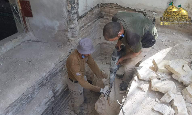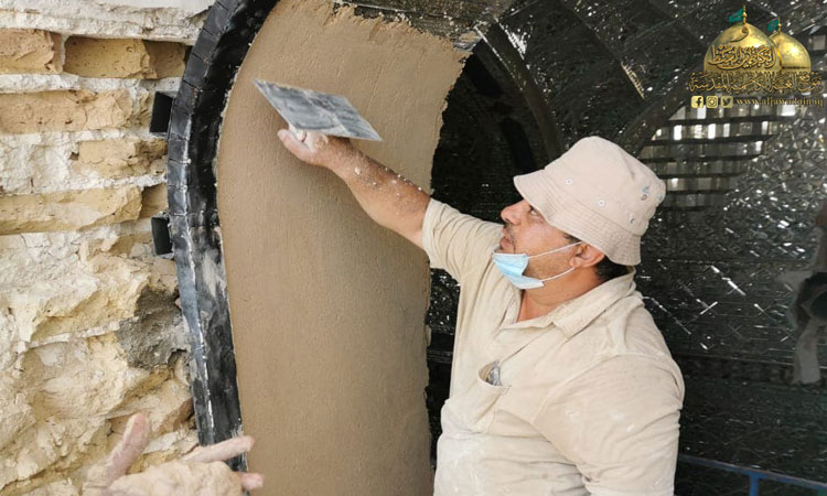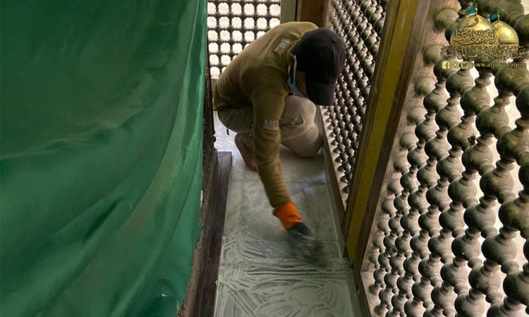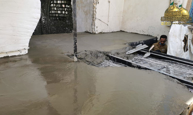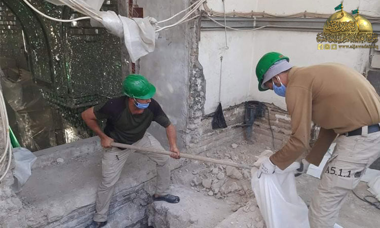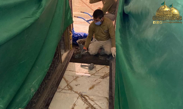 واستثماراً لقرار حظر التجوال الذي فرضته خلية الأزمة والجهات المختصة بسبب جائحة كورونا والذي أدى إلى عدم تواجد الزائرين أو قلة عددهم تم غلق الحرم والرواق لبدء العمل بحملة تأهيل وإعمار انطلاقا من أشرف بقعة في الصحن الشريف فتم صيانة المنطقة الموجودة أسفل الضريحين المقدسين باستبدال أرضية المرمر وإكساء ما بين الضريحين وداخلهما بالمرمر (الأونكس). وبأيدٍ ماهرة ومتخصصة تمت صيانة الأجزاء الخشبية لشباك الضريح واستبدال الأجزاء التالفة.. فلا يخفى على أحد أن المكان يحوي تفاصيل فنية دقيقة وقديمة في صندوقي الخاتم والمنطقة المحيطة بهما وتأثرها بعامل الرطوبة والأبخرة فكانت الحاجة إلى صيانتها بدقة عالية وبحذر وبطء حفاظا على الطابع الأثري للزخارف والآيات المنقوشة للصندوقين فضلا عن تغليفهما من الداخل بأفضل أنواع الخشب المستورد واستبدال الأعمدة الداخلية للشباك التي حفرت عليها أسماء المعصومين الأربعة عشر عليهم السلام وتبديل اللوحات الزخرفية والأقواس بنقوش مستوحاة من الفن الإسلامي ليظهر بحلة جديدة لإضافة مزيد من الرونق والبهاء لباطن شباك الضريح الذي تشرف بوضعه على القبرين الشريفين، حيث تقدر مساحة العمل بـ(2000م2).