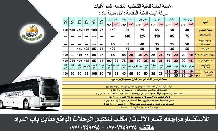 خدمة زائري أهل بيت النبوة "عليهم السلام" بكلّ أشكالها وصورها ما هي إلا الشرف الأعظم، واستناداً إلى توجيهات الأمين العام للعتبة الكاظمية المقدسة الأستاذ الدكتور حيدر حسن الشمّري، أطلق قسم الآليات في العتبة الكاظمية المقدسة برنامجاً خدمياً جديداً للزائرين الكرام وذلك من خلال تسيير رحلات يومية إلى العتبات المقدسة والمزارات الشريفة، والمنافذ الحدودية ذهاباً وإياباً، فضلاً عن تلبية دعوات الزائرين والمتعهدين الكرام حول برامج السياحة الدينية الخاصة، وتوفير السيارات الصغيرة للعوائل الراغبة بالزيارة بمفردها وبأسعار منخفضة.
