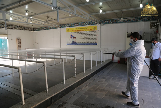 استناداً إلى توجيهات الأمين العام للعتبة الكاظمية المقدسة الأستاذ الدكتور حيدر حسن الشمّري في اتخاذ التدابير والإجراءات الوقائية لتفادي مخاطر انتشار فيروس كورونا المستجد، نفذّ فريق وحدة السلامة العامة في قسم حفظ النظام حملة تعفير واسعة شهدتها مفاصل الصحن الكاظمي الشريف، لتأمين الحماية اللازمة والحفاظ على صحة وسلامة وزائري الإمامين الكاظمين الجوادين "عليهما السلام".