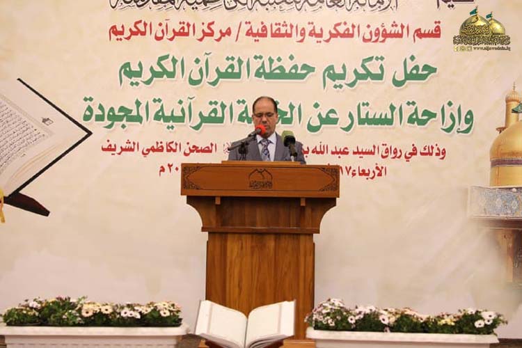 وكانت هناك كلمة لمدير المركز الوطني لعلوم القرآن الكريم في ديوان الوقف الشيعي الدكتور رافع العامري لمناسبة إزاحة الستار عن ختمته القرآنية المجودة بيّن خلالها قائلاً: ( انطلاقاً من قول الرسول الأكرم محمد "صلى الله عليه وآله": (زينوا القرآن بأصواتكم)، دأب ديوان الوقف الشيعي على حث أبنائه من ذوي الأصوات على نشر القرآن الكريم في ربوع العالم الإسلامي عن طريق إذاعة آياته بأصوات مقبولة تحمل الأداء العلمي المتقن لتكون رسالة إلى العالم الإسلامي، تؤكد مقدرة القارئ العراقي على تجويد جميع السور المباركة بفن وإتقان علمي مدروس، لذا فقد سعينا جاهدين على إظهار هذه الختمة بأروع حلة وذلك عن طريق استشارة كبار القرّاء في العالم الإسلامي وخصوصاً من الأزهر الشريف، وكذلك ممن سبقنا في هذا المجال وخاض تجربة عملية في ذلك حتى خلصنا إلى طريقة متبعة في العالم الإسلامي، ومقبولة لدى جميع الدول لتعبر عن طموحنا في أن تنشر هذه الختمة في العالم الإسلامي ليكون العراق في مقدمة البلدان في مجال الأداء القرآني.