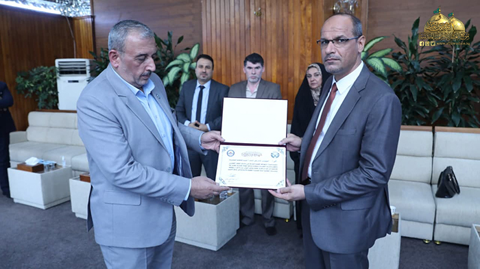 في الوقت ذاته أهدى الوفد الزائر شهادات الشكر والامتنان إلى الأمانة العامة للعتبة الكاظمية المقدسة متمثلة بخادم الإمامين الكاظمين الجوادين الدكتور حيدر حسن الشمّري، وذلك تقديراً لدوره في رعاية المشاريع الإعلامية والمعرفية والثقافية.
