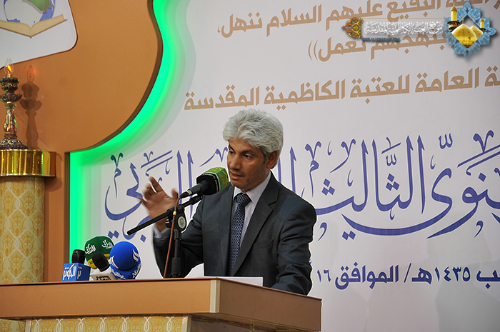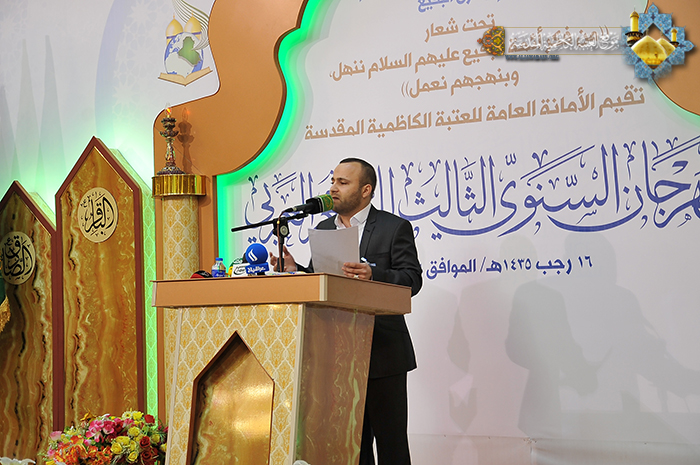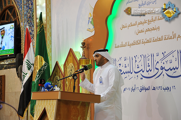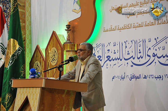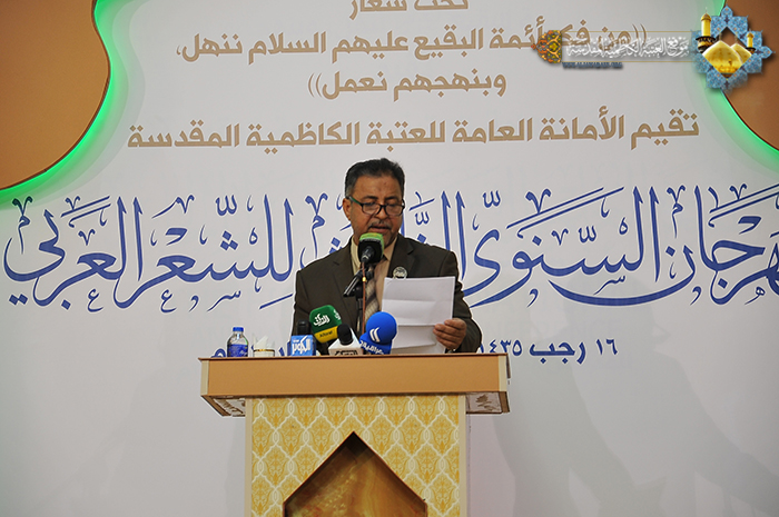 فتحت العتبة الكاظمية المقدسة أبوابها مشرعةً أمام ينابيع الفكر وفضاءات الثقافة والإبداع الأصيل، أمام الشعر والشعراء والكلمة الصادقة، أمام المفردات الجميلة في لغة الضاد، حيث مزجت بين ألوان الثقافة المتنوعة وخلاصة الأفكار، لتنسج من الخيال الواسع والإحساس المرهف أروع الصور الشعرية، وتَرسمُ لوحات وجدانية رائعة تنم عن حب أئمة البقيع (عليهم السلام)، وتسهم بتلك النتاجات المباركة رفد الحركة الأدبية والثقافية وإحياء التراث العربي الأصيل والحفاظ على الهوية الشعرية لتنير بها طريق الأجيال القادمة، إذ انطلقت صباح يوم الجمعة 16رجب الأصب 1435هـ الموافق16/5/2014م، في قاعة مضيف الإمامين الكاظمين (عليهما السلام) وقائع فعاليات المهرجان الشعري السنوي الثالث التي درجت على تنظيمه سنوياً الأمانة العامة للعتبة الكاظمية المقدسة، والمنعقد تحت شعار: " من فكر ائمة البقيع(عليهم السلام) ننهل وبنهجهم نعمل"، وحضر حفل الافتتاح الأمين العام للعتبة الكاظمية المقدسة أ.د "جمال الدباغ" وأعضاء مجلس الإدارة والشخصيات الدينية وخَدَمَة الإمامين الجوادين وكوكبة من الأدباء والكتّاب والمثقفين المتذوقين للشعر العربي الفصيح، وبمشاركة نخبة من الشعراء الذين حضروا من مختلف محافظات عراقنا العزيز، جاءوا ليساهموا برفيف نبضات قلوبهم ويظلوا بظلال قصائدهم الغراء في هذا الملتقى الأدبي. استهل حفل الافتتاح بتلاوة آيات مباركة من القرآن الحكيم شنّف بها القارئ الحاج "محمد حسين الشامي" أسماع الحاضرين بعدها صدحت حناجر فرقة إنشاد الجوادين بقراءة "أنشودة الفردوس"، تلتها كلمة الأمانة العامة للعتبة الكاظمية المقدسة وألقاها أمينها العام أ.د "جمال الدباغ" وبيّن فيها قائلاً: " نجتمع في هذه الرحاب الطاهرة لنحتفي في مهرجاننا السنوي هذا بأئمة كانوا وما زالوا قدوة ومنارا للإنسانية، إذ تركوا لنا إرثا فكريا في جميع مناحي الحياة، وهذه التركة تلقي علينا مسؤولية تأريخية لحمل رسالتهم ونشرها عبر الأجيال، ولعل من وسائل النشر والتوثيق والتثقيف هو فن الشعر العربي، وما نحن بصددهم اليوم هم أئمة أربعة تشرف بضم أجسادهم ثرى البقيع.. وأضاف قائلاً: هدفنا هو توظيف هذا الفن لنشر فكر أئمة البقيع "عليهم السلام" كما أننا نريد بلغة الضاد لغة القرآن الكريم أن تسمو وتعود سيرتها الأولى في أوساط شبابنا ومجتمعنا، فتكريس العمل لدعم الشعر العربي هو وجه من وجوه مكافحة الغزو الثقافي الذي استهدف تراثنا الإسلامي. وأشاد بالمشاركين قائلاً: بارك الله بأقلامكم التي خطت سطورها الولائية ليكتب قوافيها في سفر خالد.. وهو يترنم بفكر أئمة البقيع وسيرتهم العطرة فنتاجكم هذا هو ثمرة طيبة لإغناء التراث الشعري يهدف إلى إحياء أمر أهل البيت عليهم السلام، فرحم الله من أحيا أمرهم" وكان للجنة المنظمة للمهرجان كلمة بهذه المناسبة ألقاها الشاعر"عامر عزيز الانباري" مخاطباً فيها الحضور قائلاً: " لم يكن اللقاء عابراً ولا عفوياً بل هو لقاء المحبين والذين تترقب قلوبهم إطلالة شهر رجب الأصب فيتحقق ميعادهم ليعيشوا سعادة اللقيا عند رياض القداسة يترنمون بأحرفهم المموسقة على غدران الولاية والعقيدة بين زقزقة العصافير وتغريدة البلابل وخرير الغدران والجداول على تراب الإيمان ونفحات الرحمن في روضات الجنات في بيوت أذن الله ان ترفع ويذكر فيها اسمه.. وأضاف قائلاً: لقد حرصت الأمانة العامة للعتبة الكاظمية المقدسة على إقامة المهرجان الشعري ورعايته عاماً بعد عام حرصاً منها على خلق فضاءات ومساحات واسعة للإبداع، تحتضن فيها المواهب والقدرات الأدبية لتنتج مزايا وفنوناً شعرية تعبر عن خصوصية لآل البيت "عليهم السلام" ذات مستوى عالٍ من العطاء والإبداع، وكان دور لجنة تقويم النصوص اختيار ما هو أفضل لأجل أن يكون الاختيار مميزا لهذا العام أملاً منها أن يصبح المهرجان السنوي للشعر العربي في العتبة الكاظمية المقدسة مضماراً يتبارى ويتسابق فيه المبدعون من الشعراء، ونؤكد ذلك أن القصائد المختارة للمشا