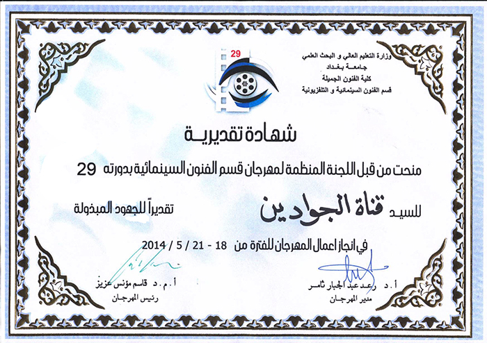 تطمح الأمانة العامة للعتبة الكاظمية المقدسة بأداء رسالتها في جانب الإعلام الهادف ونشر الفكر المحمدي الأصيل، مؤمنة بأن الإعلام هو الشريك الأول للمجتمع، لذا يجب أن يأخذ مكانته الحقيقية ويمارس دوره التوعوي والتثقيفي والإرشادي فضلاً عن النقد الموضوعي البناء، وهذا ما يجب أن تلتزم به جميع وسائلها الإعلامية المقروءة والمرئية والمسموعة لتجعلها رافداً مهماً من روافد الإعلام الصادق يسعى لنشر الكلمة الطيبة وتثقيف الأمة نحو نهج أهل البيت"عليهم السلام" الإنساني، لتكون مؤثرة إيجاباً في بناء المجتمع وفق المقومات السلوكية الصحيحة وعلاجها للآثار والظواهر السلبية، وهذا ما دأبت عليه قناة الجوادين "عليه السلام" من خلال المشاركة في النشاطات والفعاليات الخارجية. لذا حصلت قناة الجوادين"عليهما السلام" على شهادة تقديرية منحت لها من قبل اللجنة المنظمة لمهرجان قسم الفنون السينمائية بدورته "29" في جامعة بغداد ـ كلية الفنون الجميلة، تقديراً لجهودها المباركة في أعمال المهرجان المنعقد من 18ـ 21/5/2014م للفلم روائي القصير بعنوان "التحاق" الذي أخرجه الخادم "عمار الشويلي" والذي حاز على جائزة أفضل تصوير.