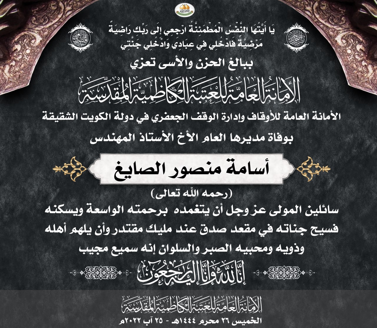 ببالغ الحزن والأسى تعزي الأمانة العامة للعتبة الكاظمية المقدسة الأمانة العامة للأوقاف وإدارة الوقف الجعفري في دولة الكويت الشقيقة بوفاة مديرها العام الأخ الأستاذ المهندس أسامة منصور الصايغ رحمه الله تعالى
