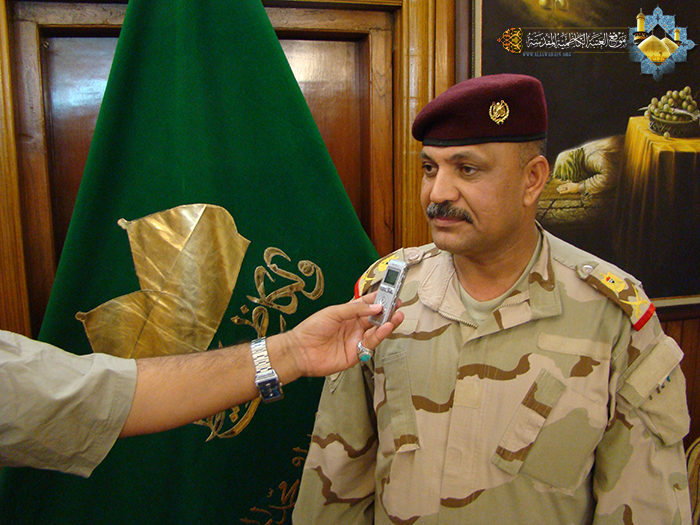 وأعلموا أن قواتنا الأمنية تتمتع بروحية عالية وباسلة لأجل مكافحة جرذان داعش ومن يلف حولهم من زمر النظام البعثي المجرم، وإن شاء الله تعالى سيشهد التاريخ والعالم أجمع بشرف وإخلاص وثبات وعقيدة جيشنا العراقي الباسل وما يسطره من ملاحم وبطولات خالدة للدفاع عن أرض الوطن ومن هذه الرحاب الطاهرة أبيّن للجميع إننا استطعنا أن نتغلب على هذه المحنة، وأوجه ندائي لكل الضباط والمقاتلين في الصمود بمواضعهم للدفاع عن أرضهم وبلدهم وهذا هو واجبهم الوطني والشرعي، وأختتم حديثه قائلاً: "أشيد بالوقفة البطولية والمشرفة من أبناء العتبات المقدسة مع أخوانهم من أبناء جيشنا الباسل".