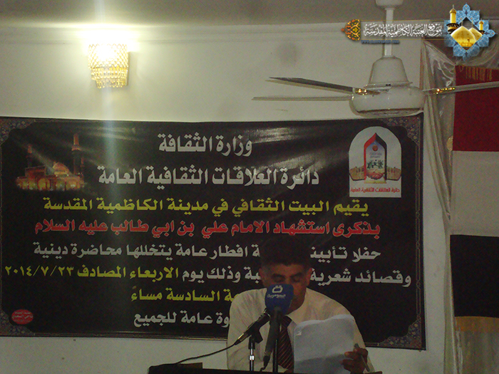 إنطلاقاً من قول إمامنا الصادق"عليه السلام": (أحيوا أمرنا رحم الله من أحيا أمرنا) وتأكيداً على مبدأ التواصل والتعاون في إحياء مناسبات أهل بيت النبوة "عليهم السلام" قام وفد خَدَمَة الإمامين الجوادين في قسم العلاقات العامة بتلبية دعوة البيت الثقافي في مدينة الكاظمية المقدسة لحضور الحفل التأبيني الذي أقيم في المناسبة الأليمة لذكرى استشهاد إمام البررة وقاتل الفجرة أمير المؤمنين علي بن أبي طالب "عليه السلام" . ويذكر أن الحفل قد شهد محاضرات دينية وقصائد شعرية استذكرت خلالها السيرة المباركة لأمير المؤمنين "عليه السلام" ودوره الكبير في الملاحم والبطولات التي سطرها للدفاع عن الإسلام .